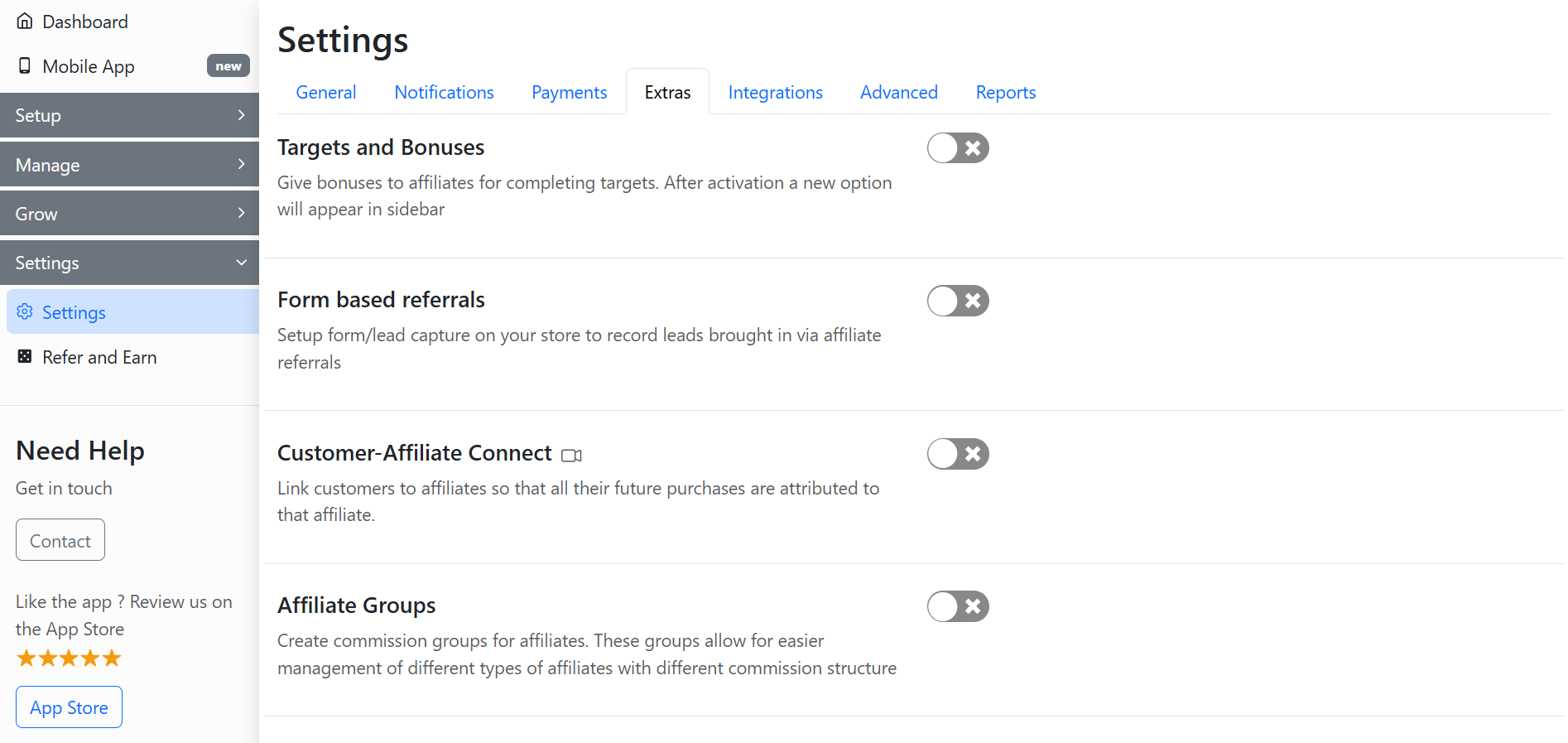 To give commission to affiliates on recurring payments, go to the **Extras** section in the **Settings** tab of the GoAffPro admin panel.
