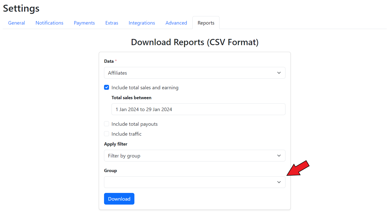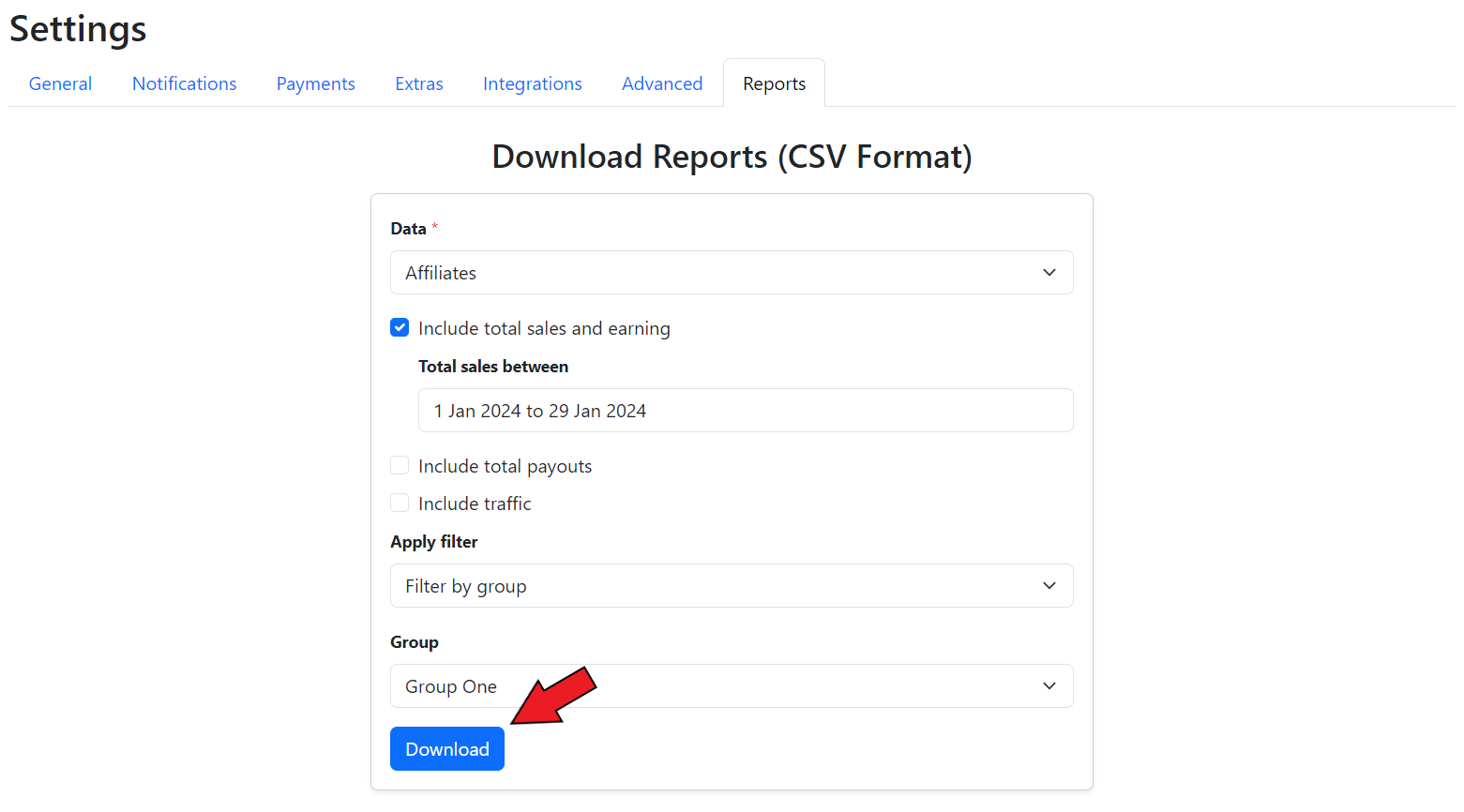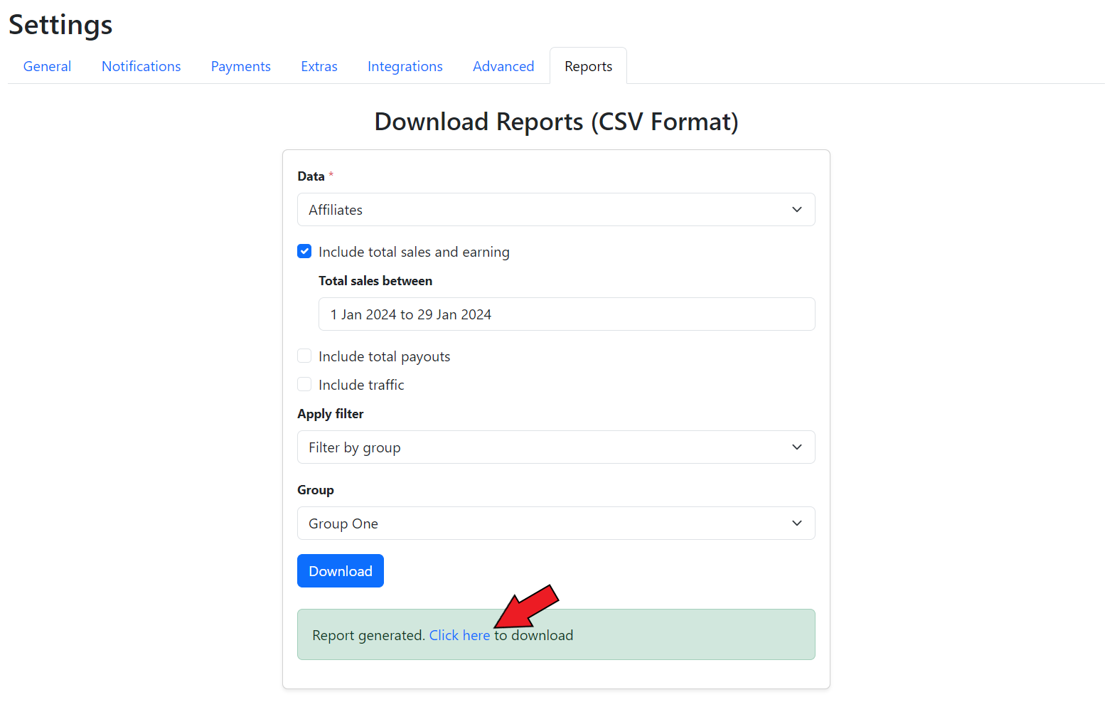 To download the data reports for the commission groups, go to the **Reports** section in the **Settings** tab of the GoAffPro admin panel.