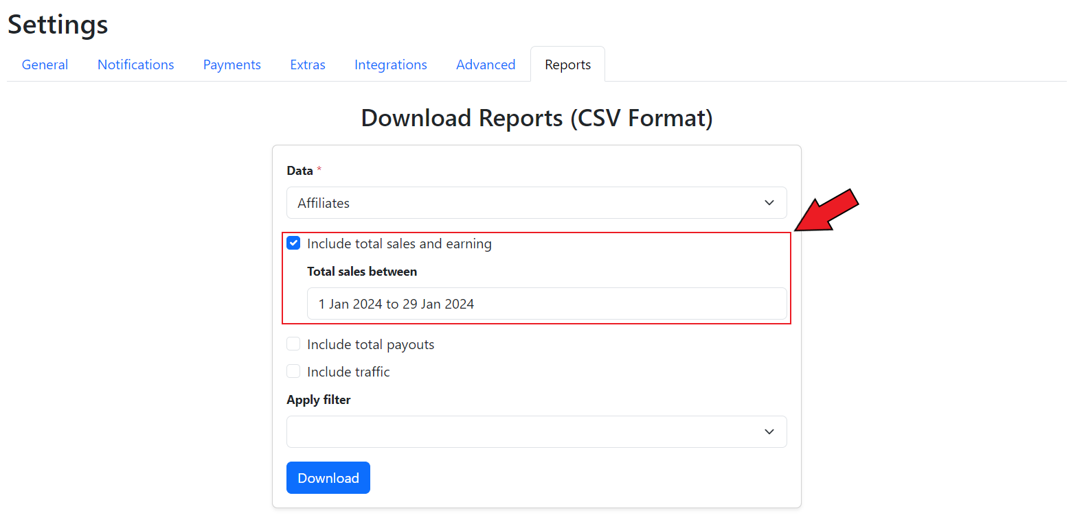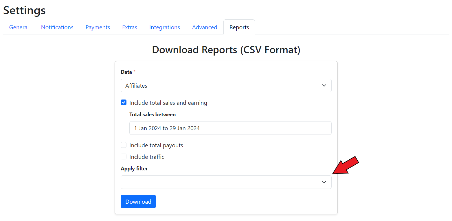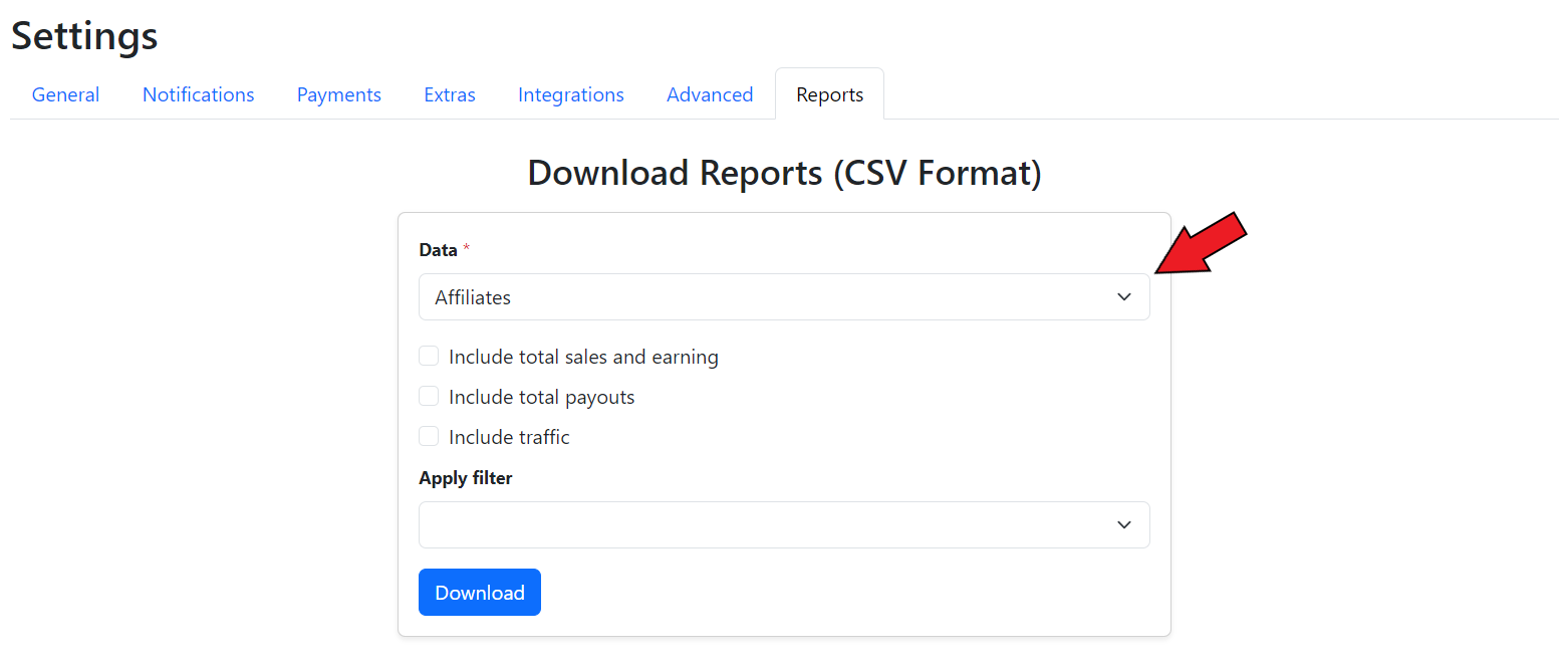 To download the data reports for the commission groups, go to the **Reports** section in the **Settings** tab of the GoAffPro admin panel.