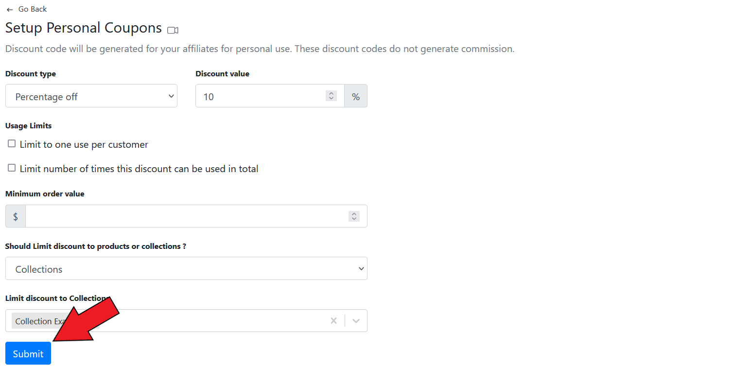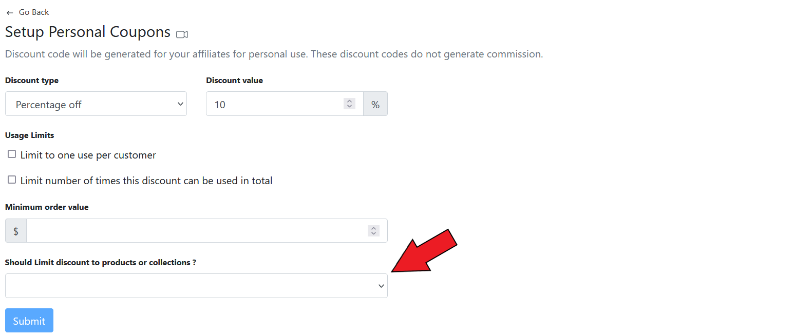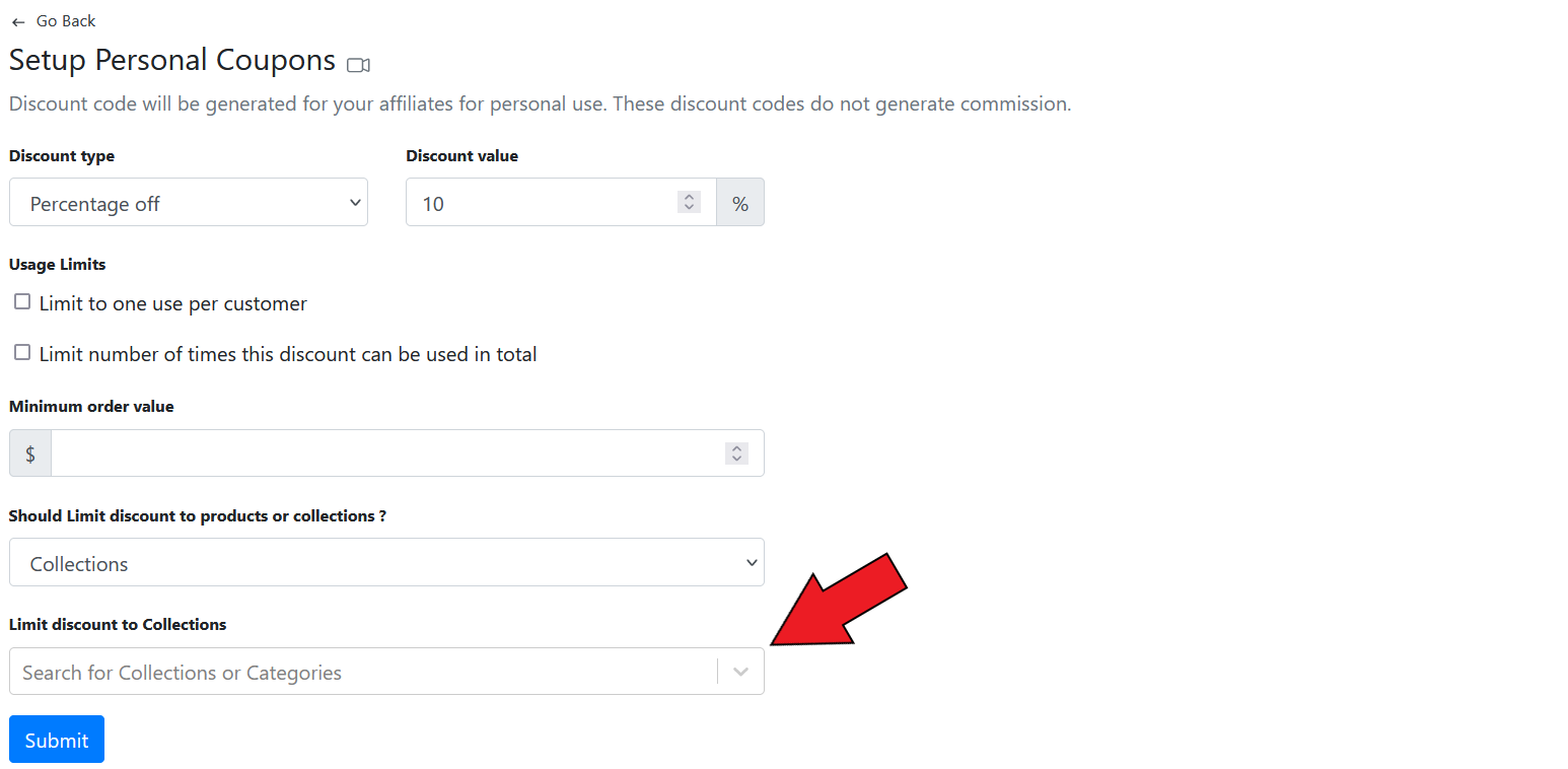 **GoAffPro** provides you with the option to limit personal coupon usage to collections.