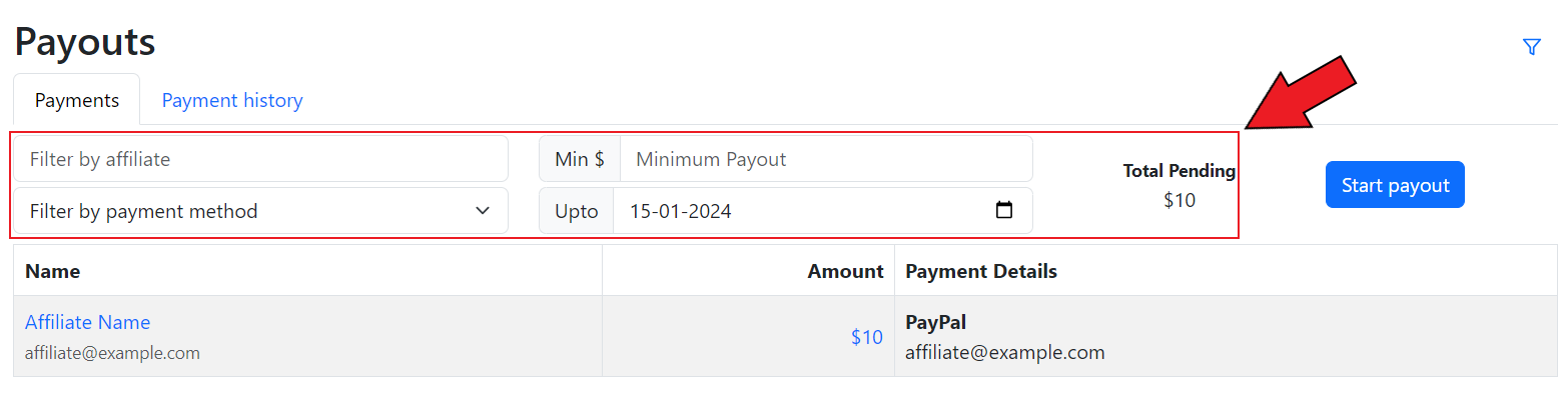 Here, you can filter the pending payments by the affiliate's name, payment method, minimum payout amount, and the "upto" date. You can also view the total pending amount that is to be paid.