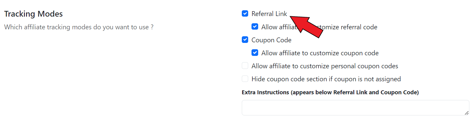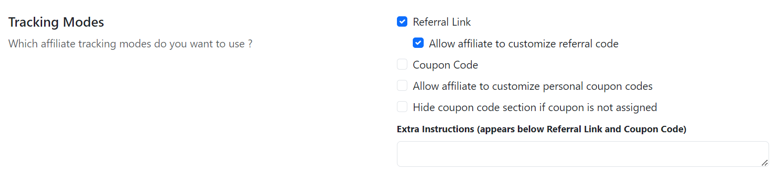 The tracking modes option allows you to disable referral link tracking. If disabled, sales made using affiliate referral links will not get tracked.&#x20;