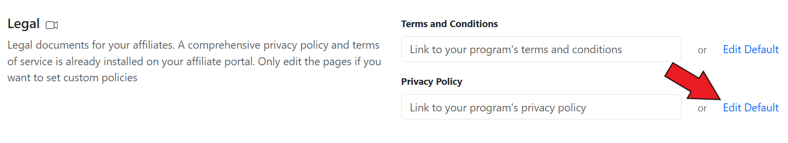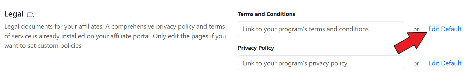 A comprehensive privacy policy and terms of service are already set for your affiliate portal. It is advised, not to make any changes to the legal documents. If you want to set custom policies for your affiliate portal, you have the choice of editing the existing documents or you can upload your own set of documents.&#x20;