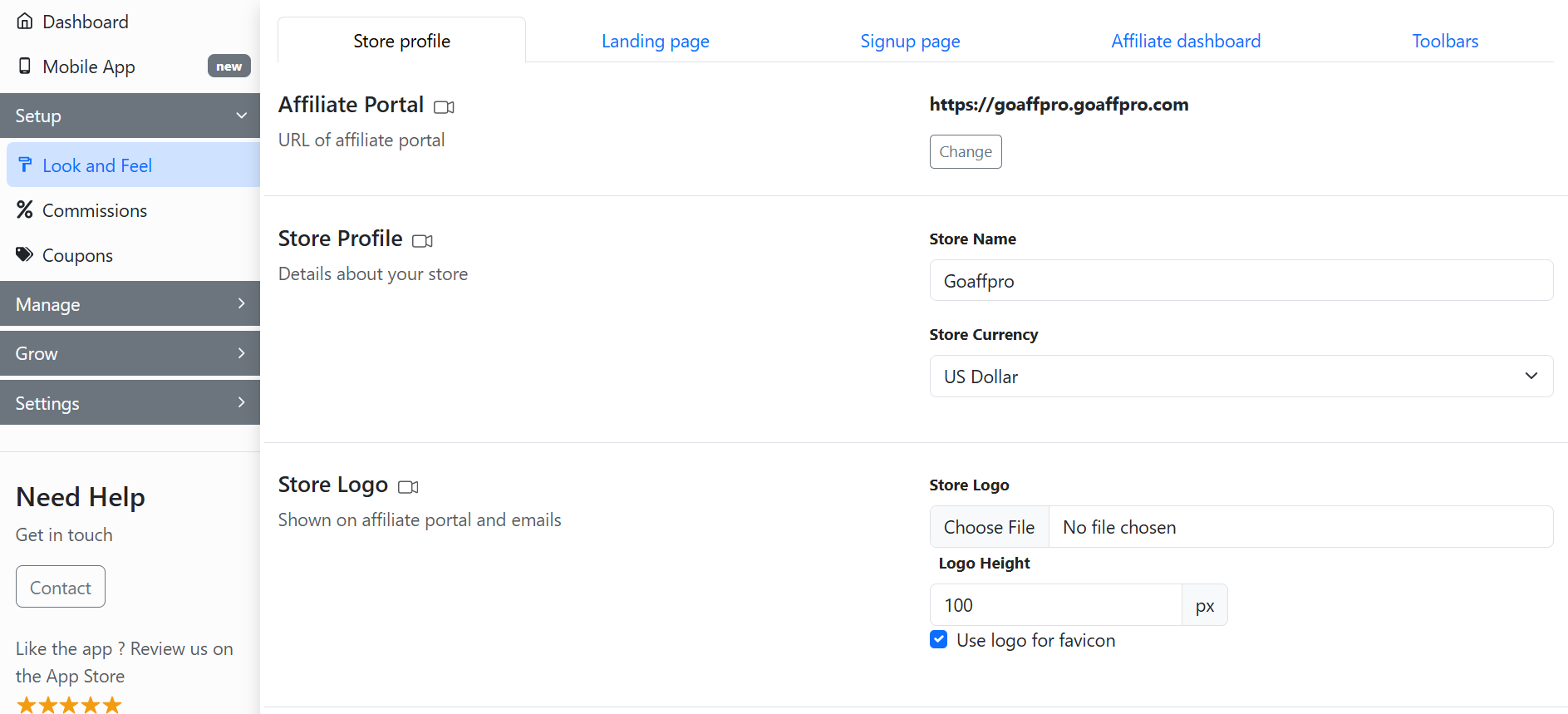 To set up the legal documents, go to the **Store profile** section in the **Look and Feel** tab of the GoAffPro admin panel.