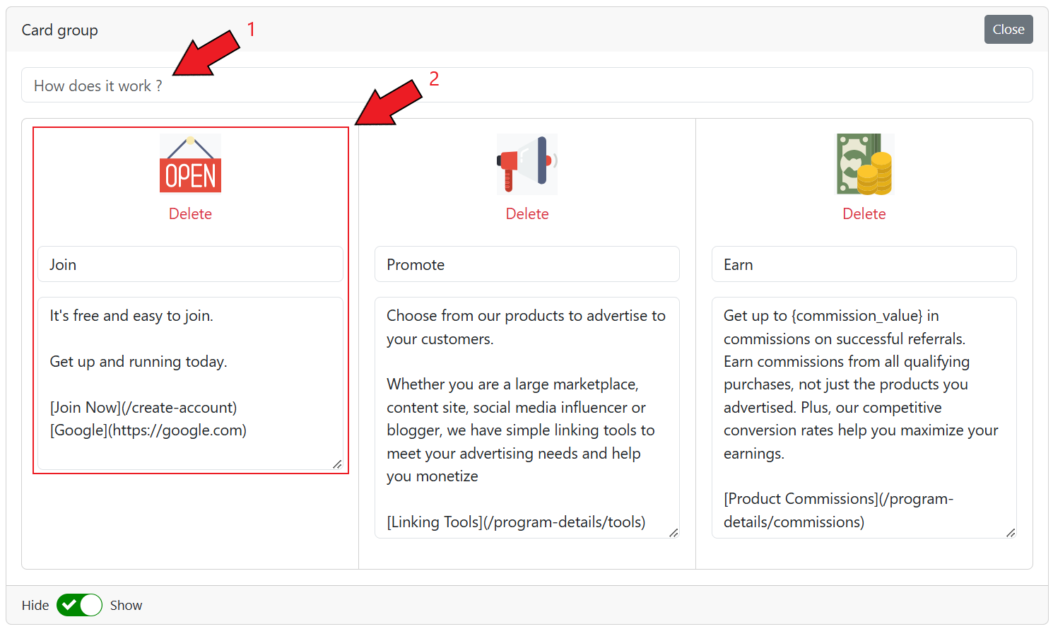 The **Card Group** section is used to display the information about your affiliate program such as the benefits of becoming an affiliate, promoting products to their followers, and earning a commission on every sale made using their referral.
