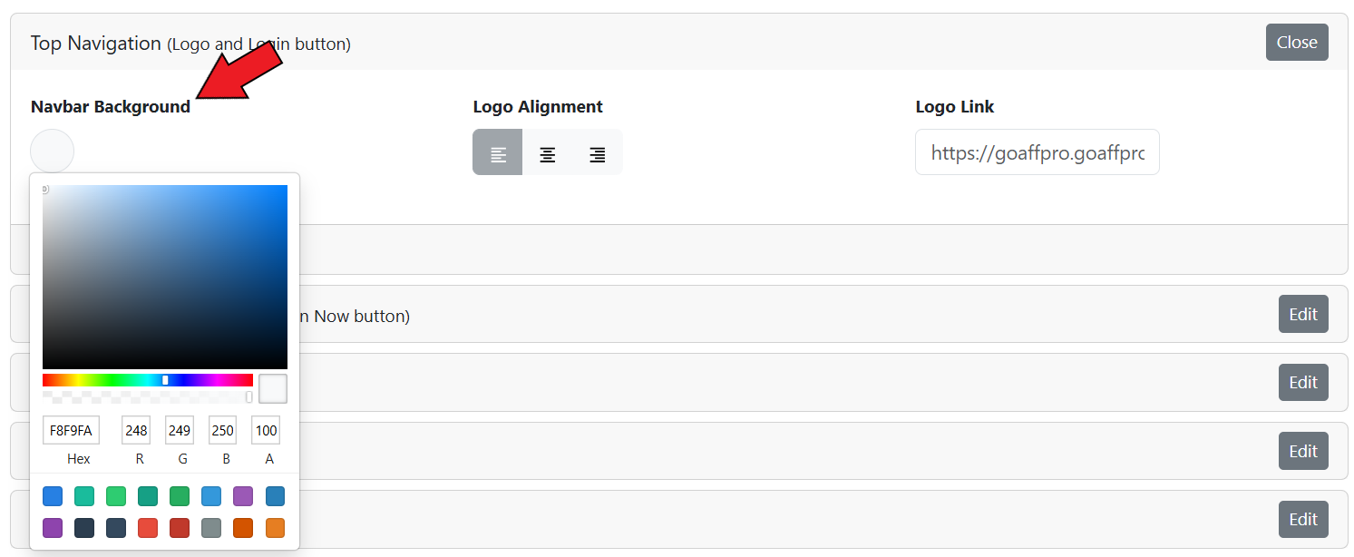 <figure><img src="https://1200686697-files.gitbook.io/~/files/v0/b/gitbook-x-prod.appspot.com/o/spaces%2F-LdPzLtyP46oY7cyXnkw%2Fuploads%2FoW3LqMQMl90yuZoH2gu5%2FScreenshot%202024-10-28%20180520.png?alt=media&#x26;token=d7b1a2f3-df28-407b-8bf3-babf678d279c" alt=""><figcaption><p>Navbar Background Color</p></figcaption></figure>