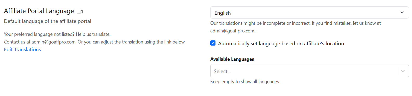 You can also edit specific translations to make it easier for your affiliates to understand the affiliate portal. If your language is not listed, you can contact us at <admin@goaffpro.com>