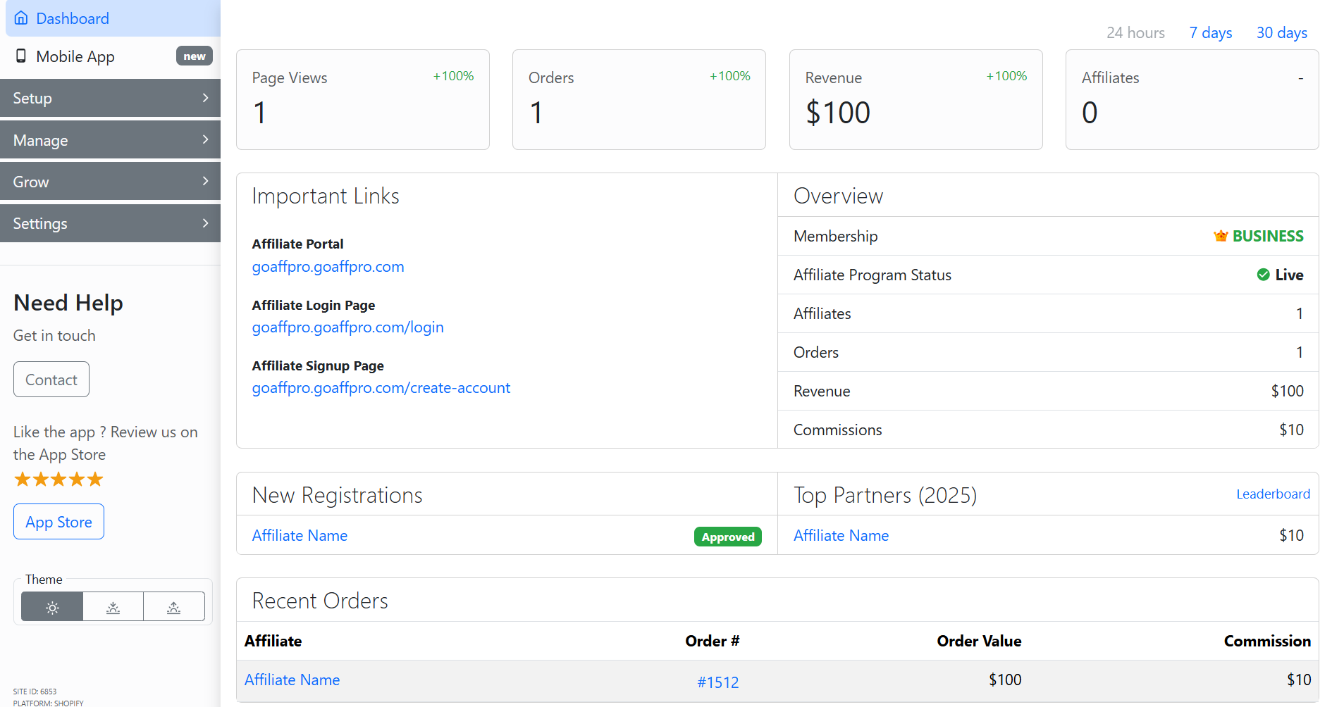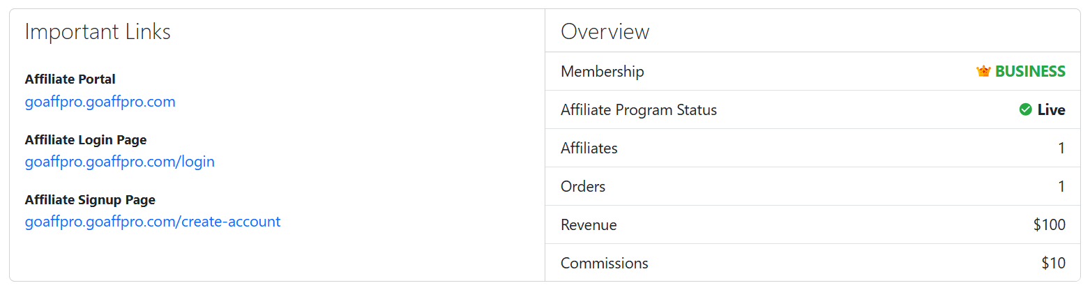 * **Affiliate Program Status:** This shows the status of your affiliate program. If it is live, then visits and orders are getting tracked.