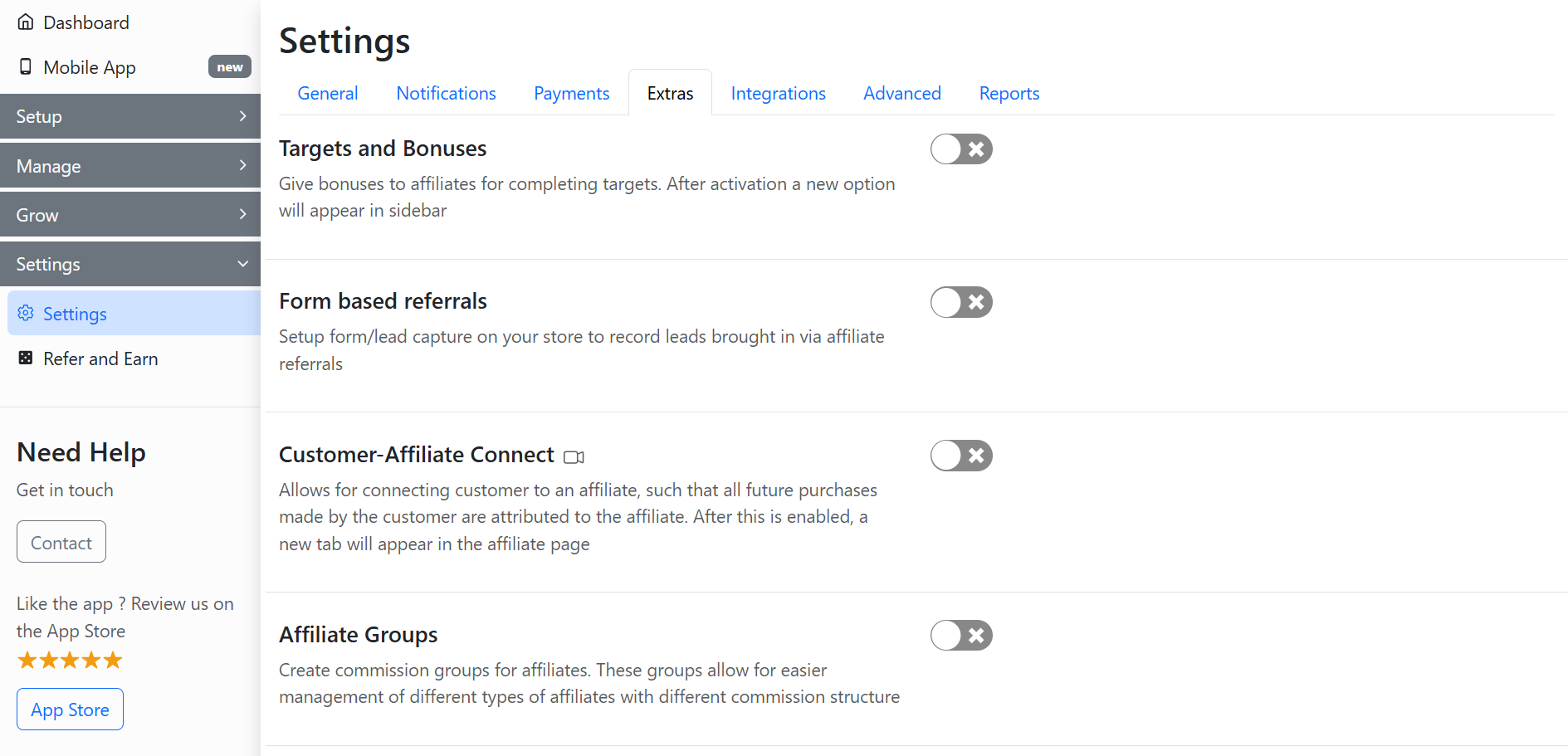 In the **Extras** section, you can enable features such as targets and bonuses, customer-affiliate connections, affiliate groups, invoices, and more.