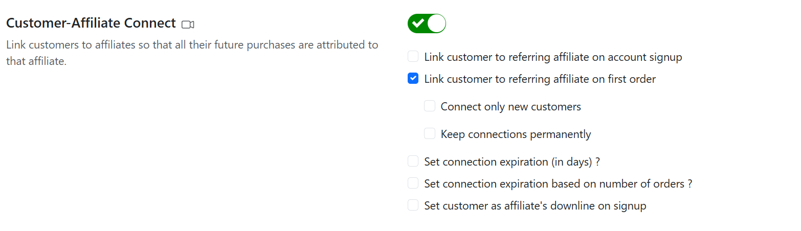 **Customer Affiliate Connect** option allows you to connect your customers to an affiliate, this will attribute all future purchases made by them to the connected affiliate.&#x20;