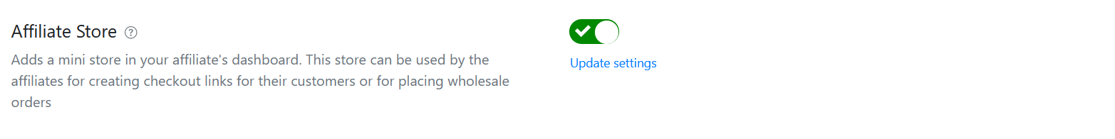 The **Affiliate Store** option allows you to add a mini store in the affiliate dashboard. This store can be used by affiliates to make purchases and create checkout links for their customers.