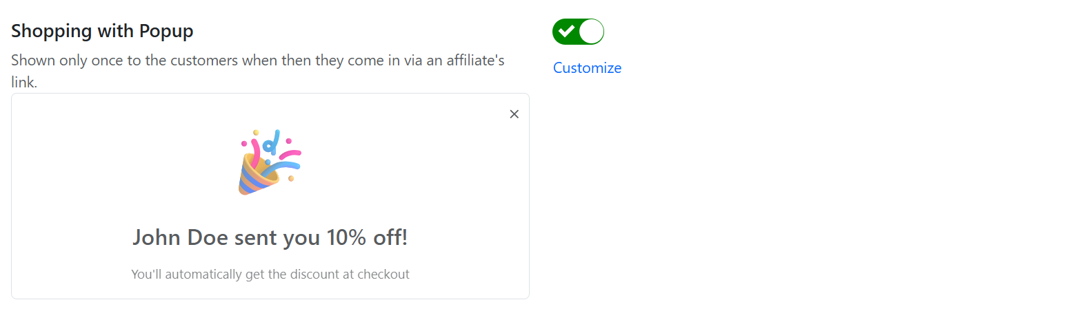 Display a [shopping with popup](https://docs.goaffpro.com/affiliate-portal-customization/toolbars/setup-shopping-with-popup) to customers when they visit your store using an affiliate's referral link.&#x20;