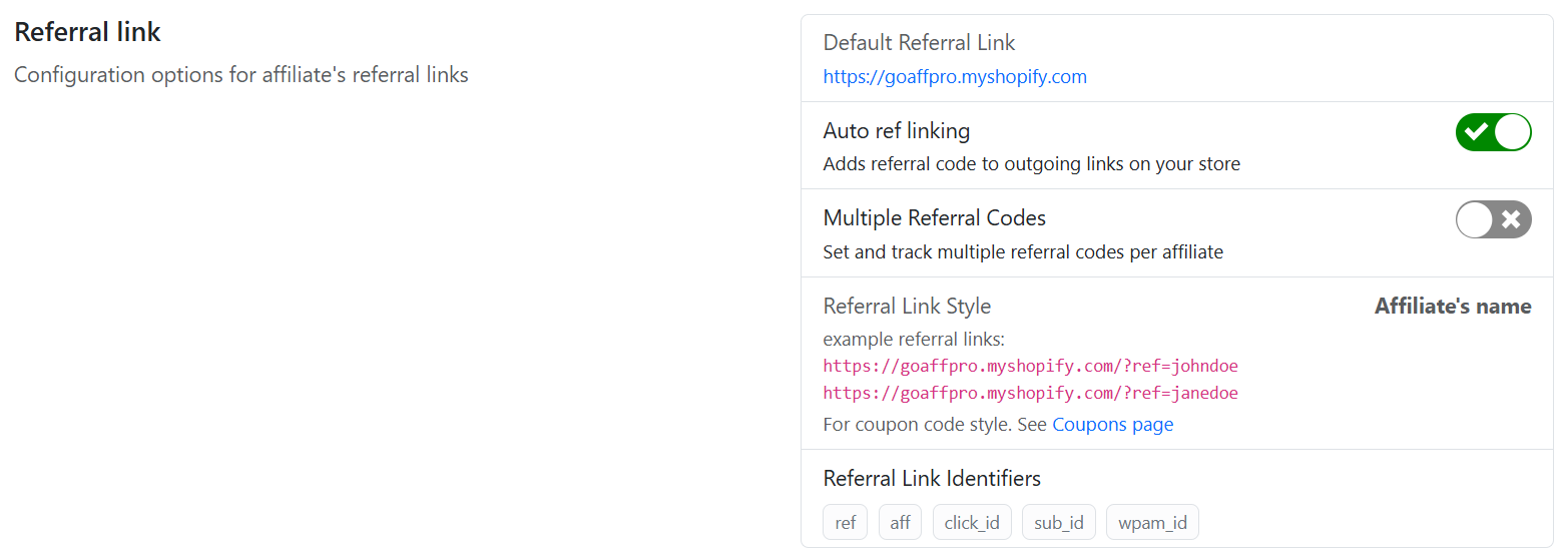 The [Referral Link settings](https://docs.goaffpro.com/program-settings/referral-link-configuration) have been updated. The following options are now consolidated under a single section: