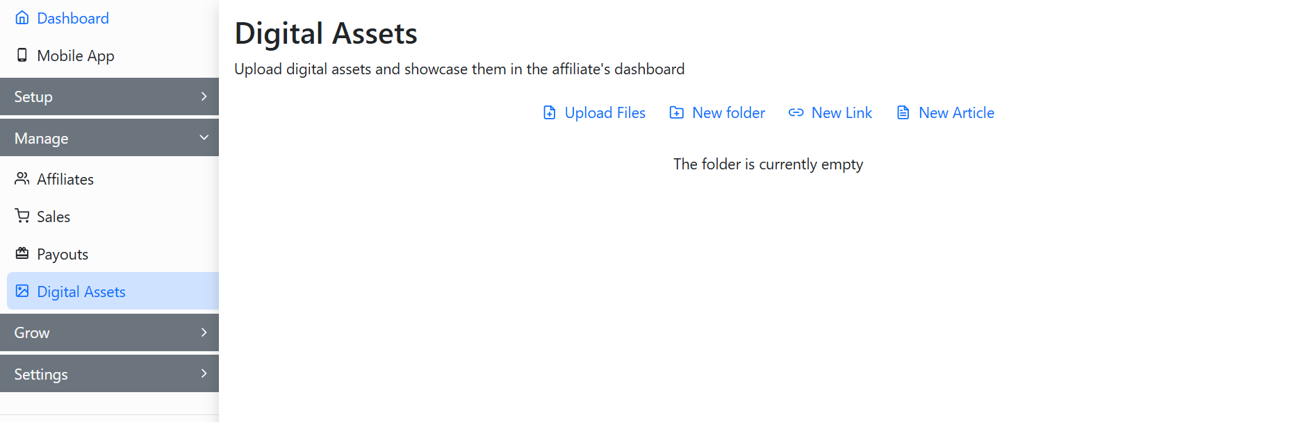 Upload [digital assets](https://docs.goaffpro.com/program-management/upload-digital-assets-for-affiliates) such as files, links, and articles for your affiliates. They can access these assets from their dashboard and utilize them for promotions.