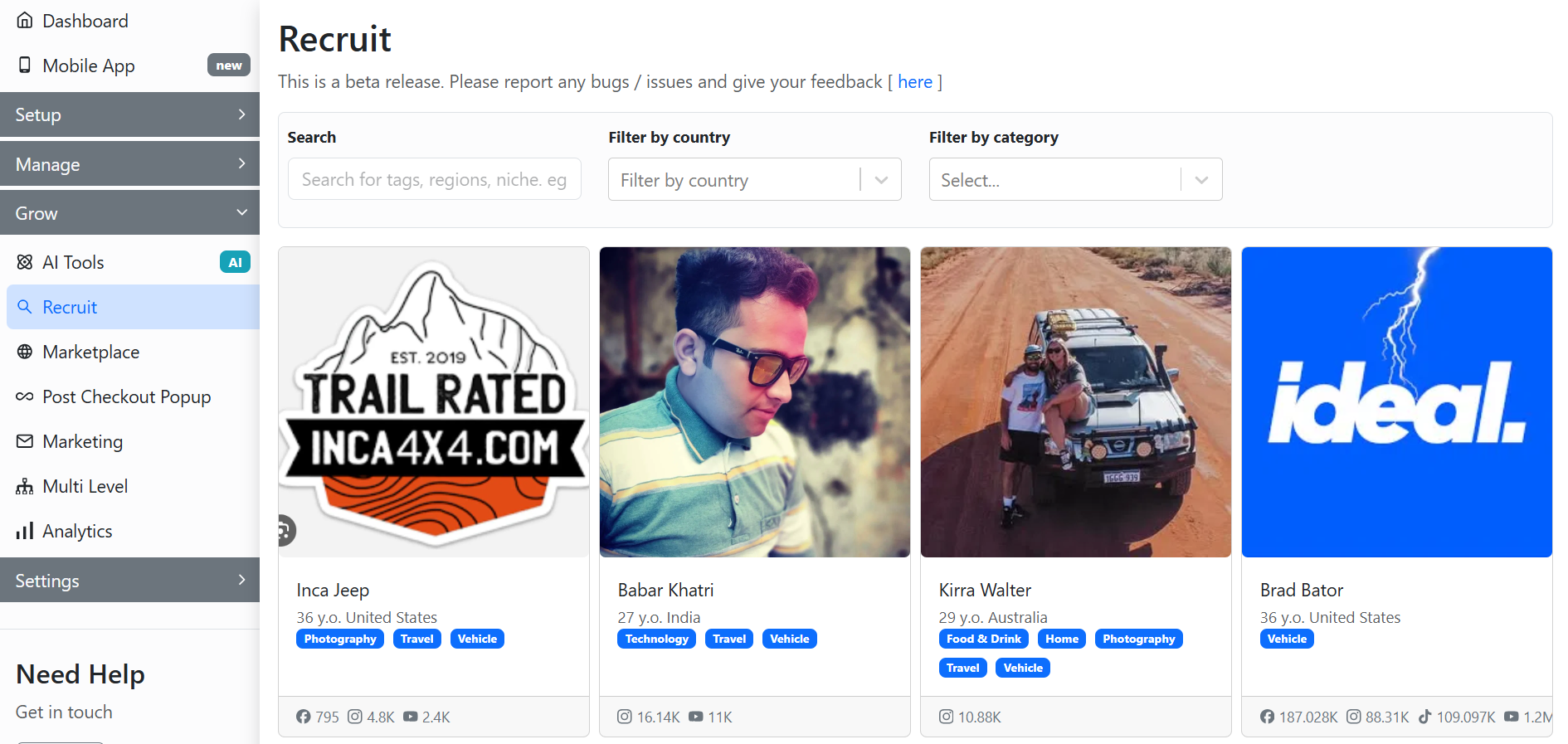 The recruit option allows you to [find and recruit influencers](https://docs.goaffpro.com/how-tos/recruiting-affiliates/recruit-influencers) for your affiliate program. It helps you locate influencers within your niche, region, or category, and lets you invite them to join your program.