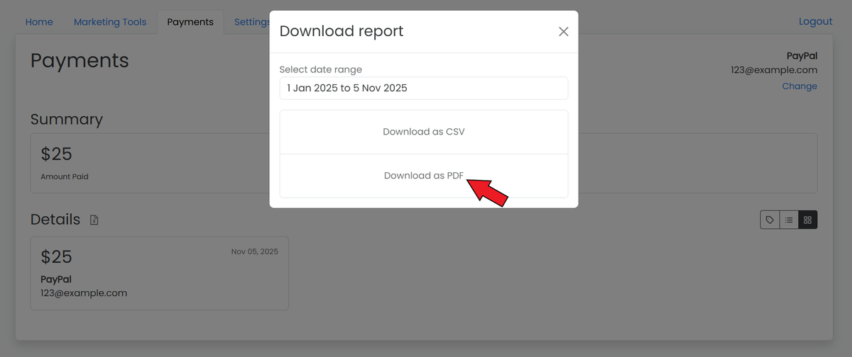 After enabling, affiliates can download their payout earnings report from the Payments section in their dashboard.&#x20;