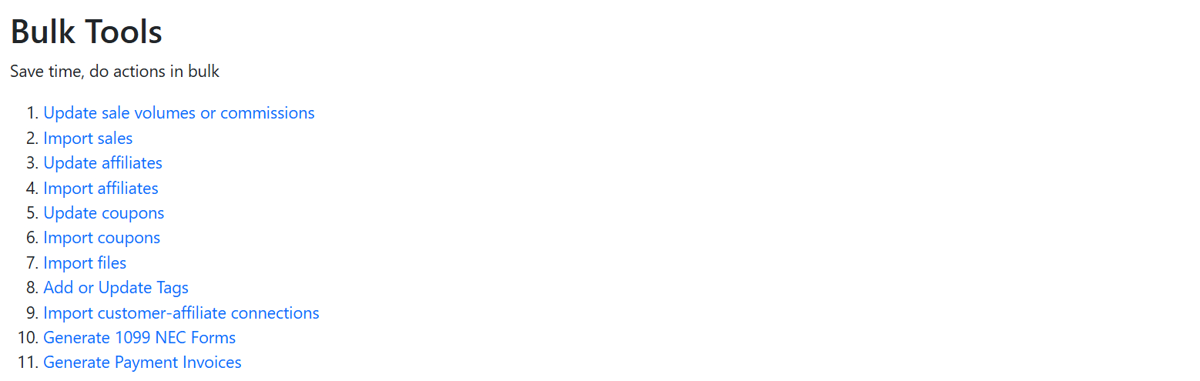 Use bulk tools to perform [bulk operations](https://docs.goaffpro.com/program-settings/extra-settings/use-bulk-tools) such as importing or updating sales, commissions, affiliates, coupons, and customers in your affiliate program.