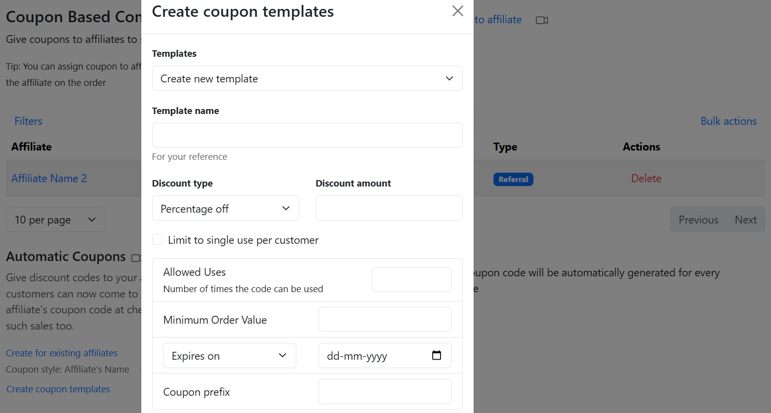 Here, you can create the coupon template and then [assign coupons](https://docs.goaffpro.com/affiliate-coupons/setup-referral-coupons/create-coupon-templates#assign-coupon-to-the-affiliate) to affiliates using that template.