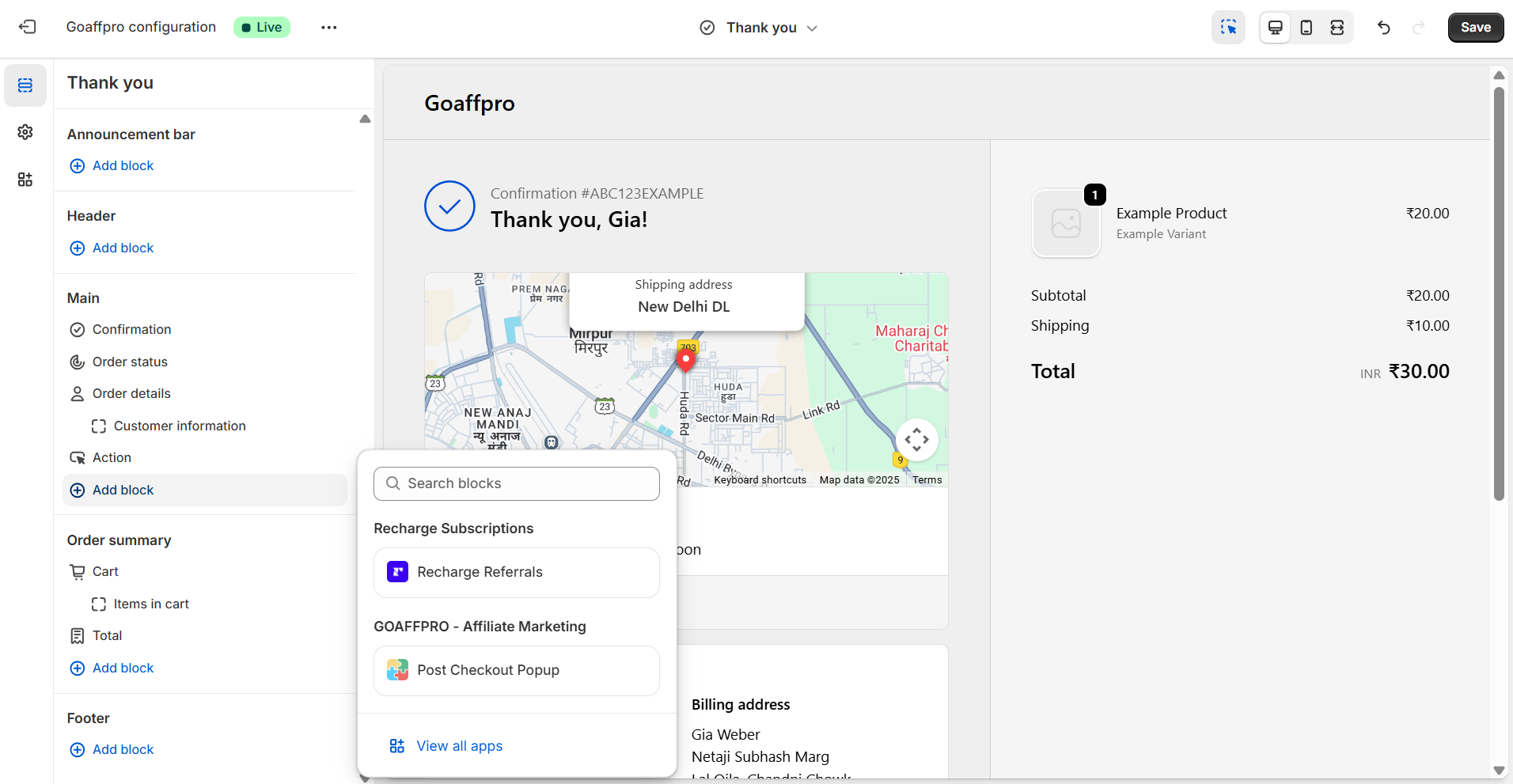<figure><img src="https://1200686697-files.gitbook.io/~/files/v0/b/gitbook-x-prod.appspot.com/o/spaces%2F-LdPzLtyP46oY7cyXnkw%2Fuploads%2FqLnvTEOgENzhcV80vEbz%2Fimage.png?alt=media&#x26;token=ee133e1b-2ceb-453e-9359-3c1ffda6dd1c" alt=""><figcaption><p>Shopify admin panel > Online Stores > Theme > Customize > Checkout &#x26; new customers > Thank you > Add block > Post Checkout Popup</p></figcaption></figure>
