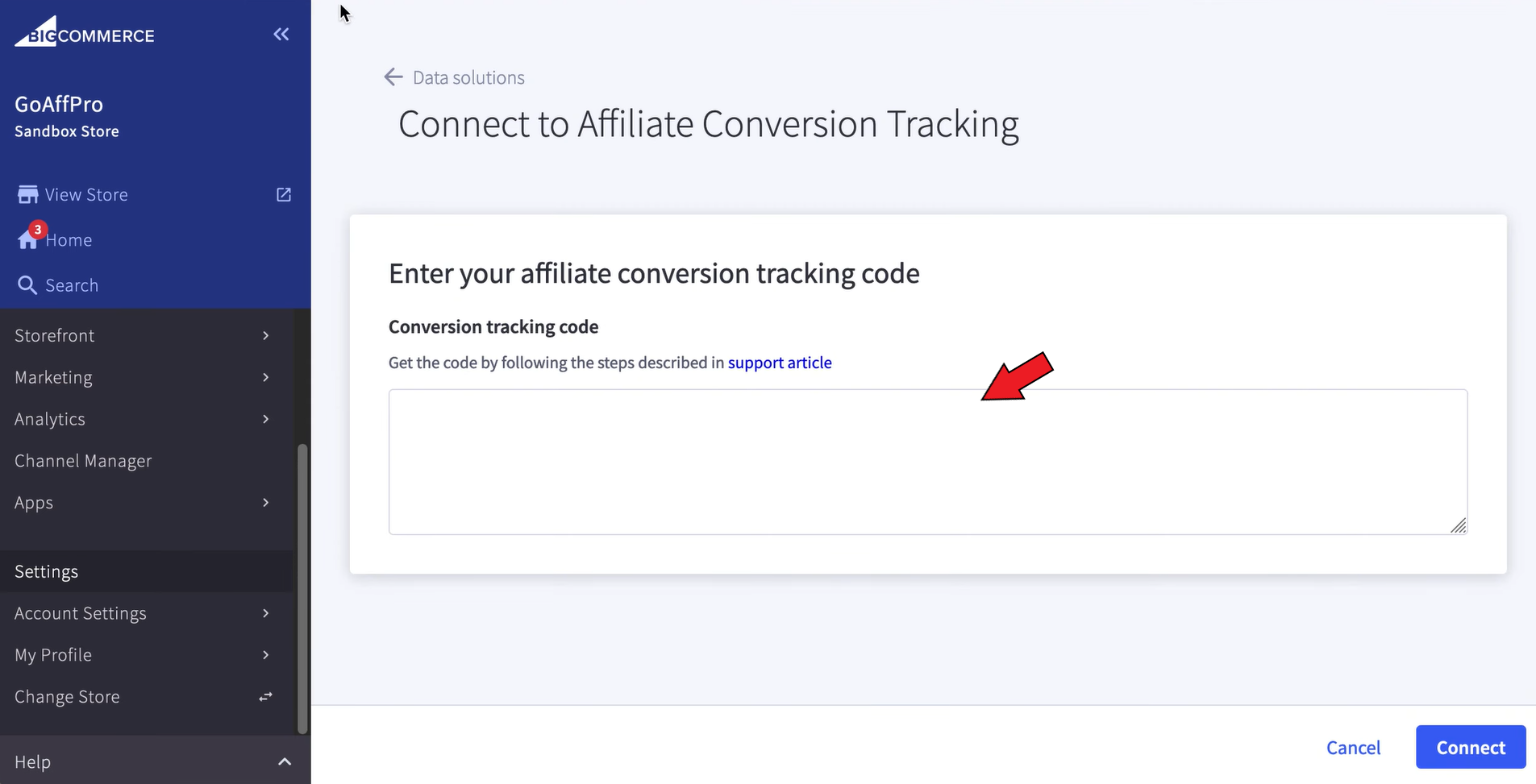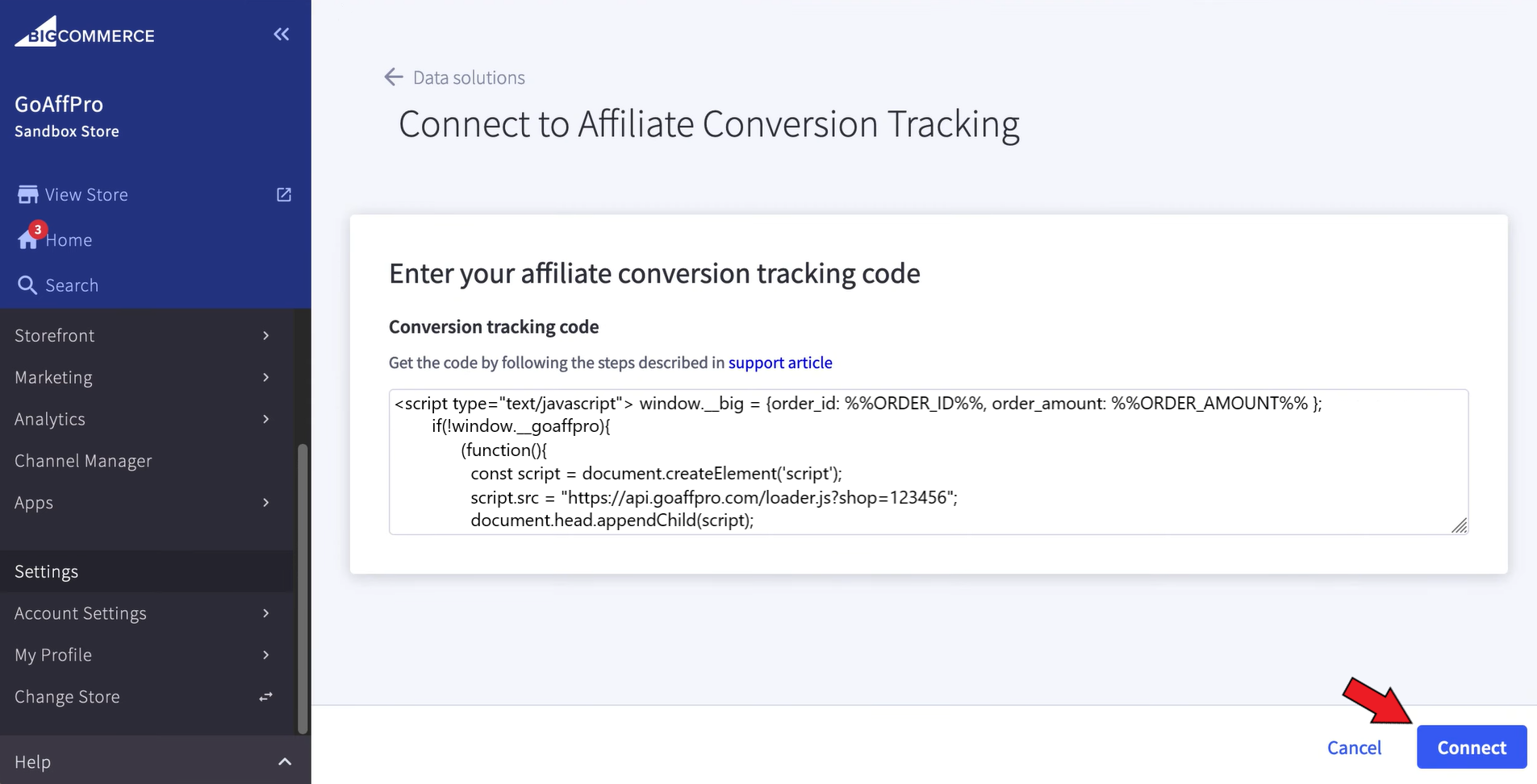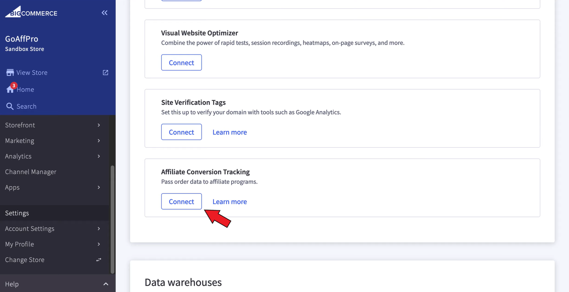 In the Affiliate Conversion Tracking option, click on **Connect**.&#x20;