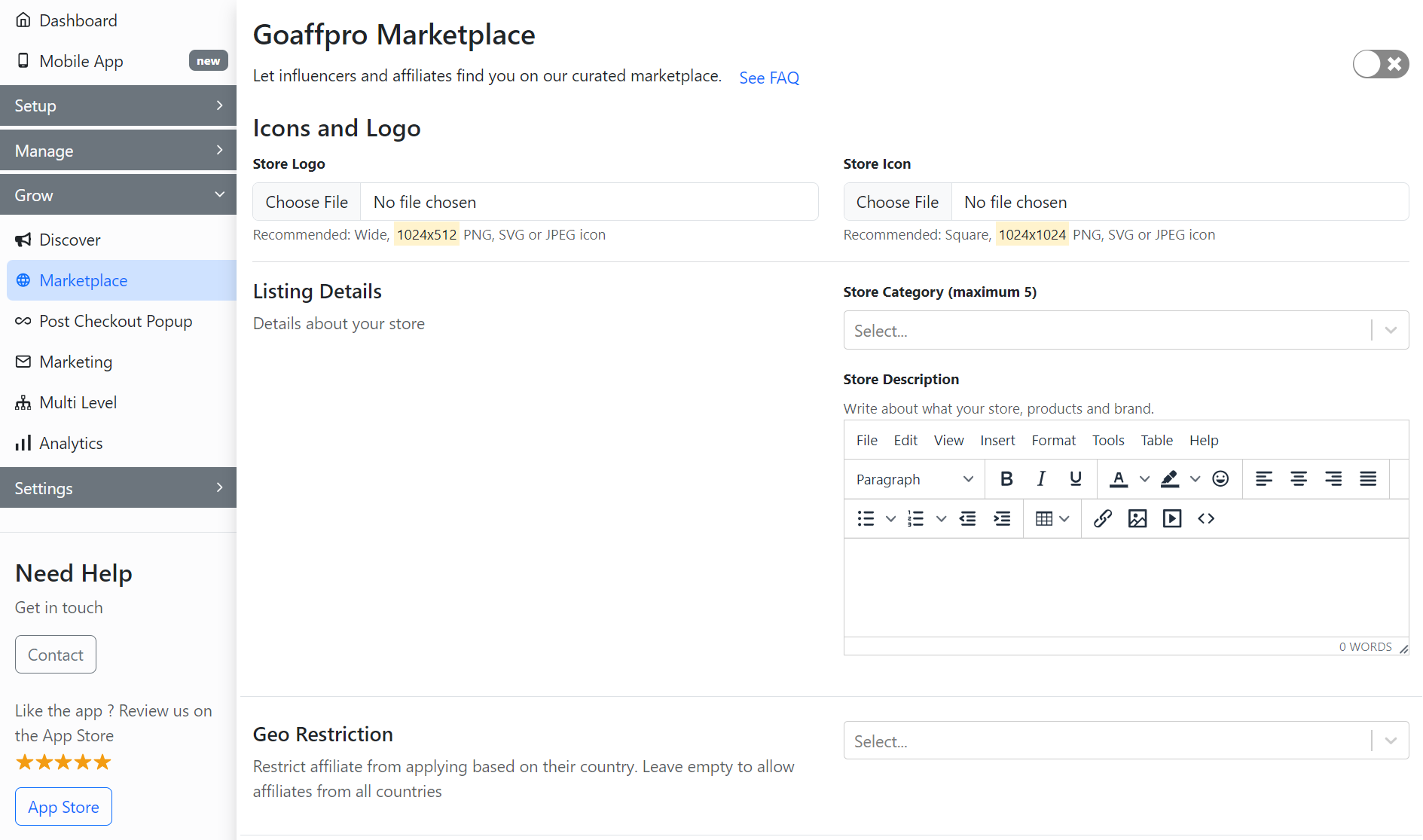 **GoAffPro** provides you with the option to set up the marketplace listing for your affiliate program.
