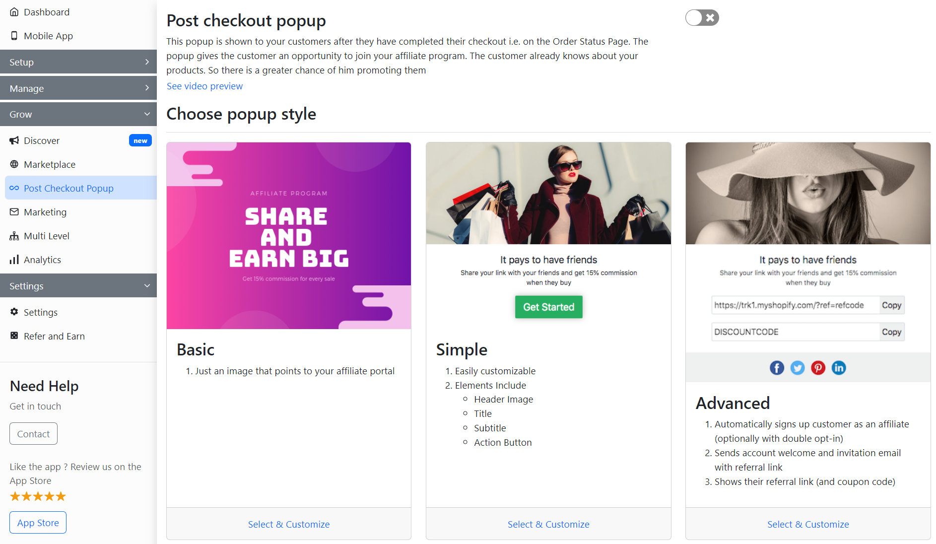 GoAffPro lets you set up and customize the popup, to do that, enable the **Post Checkout Popup.**