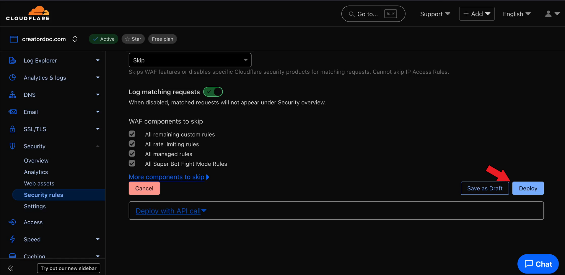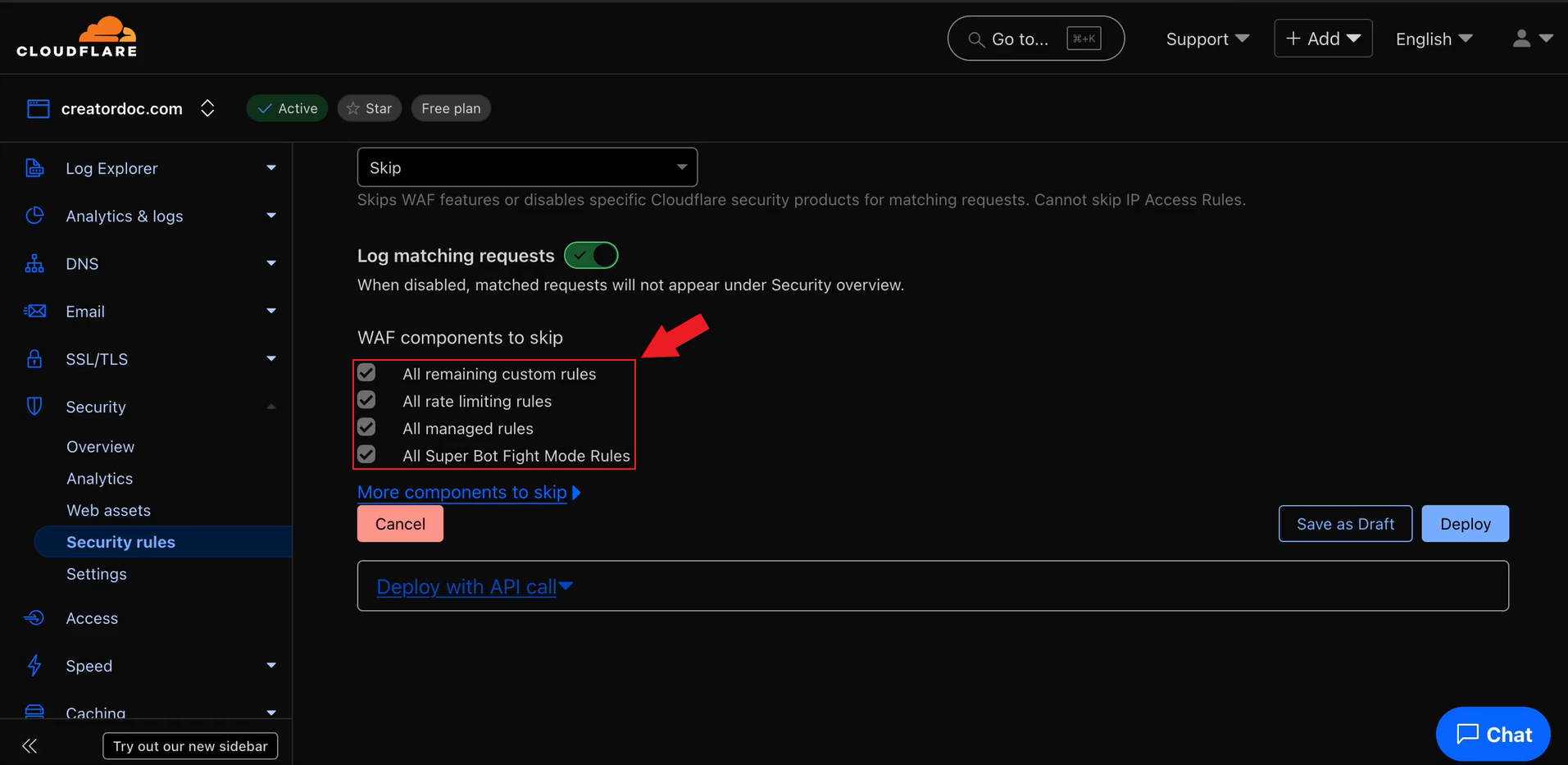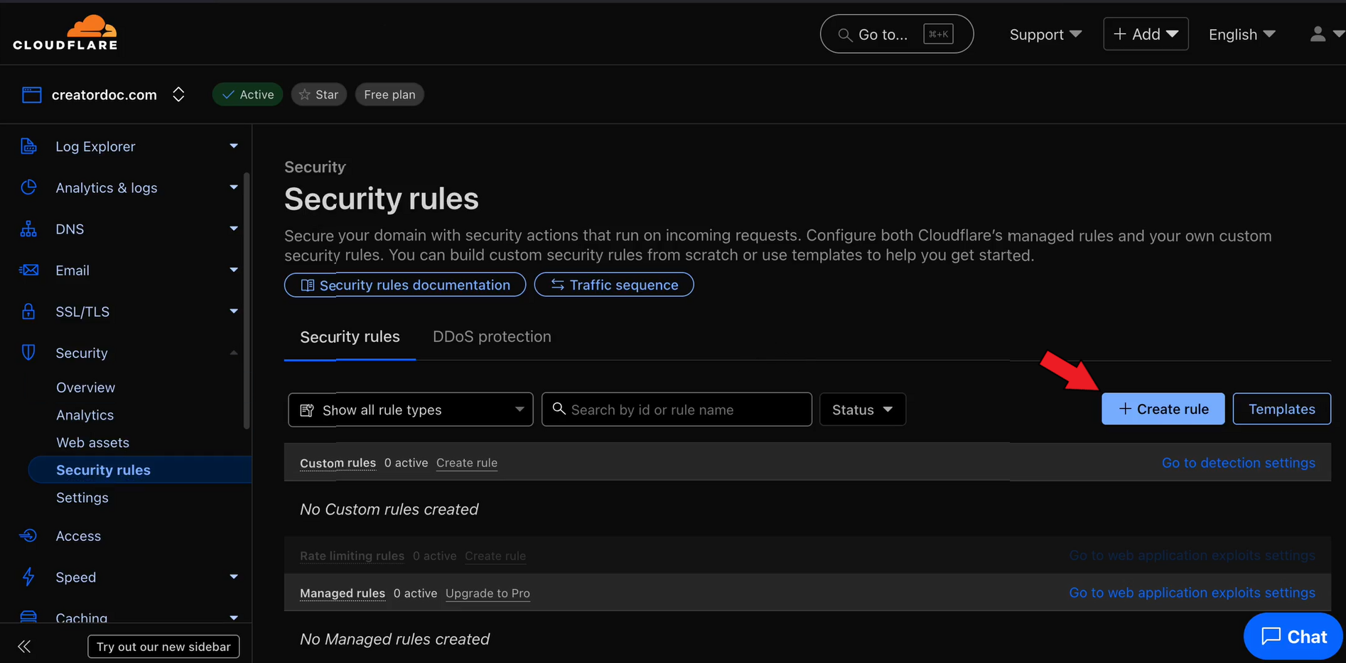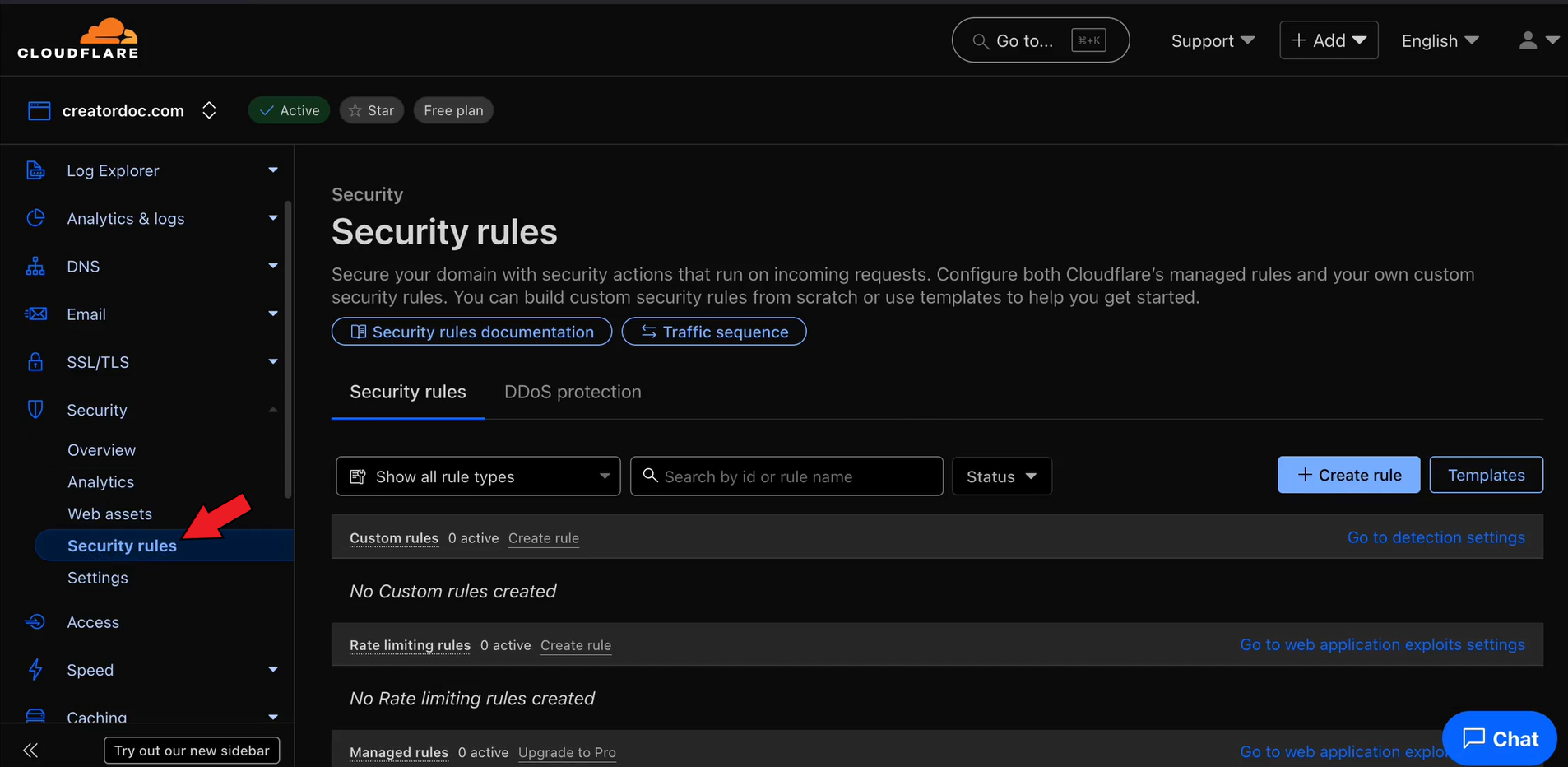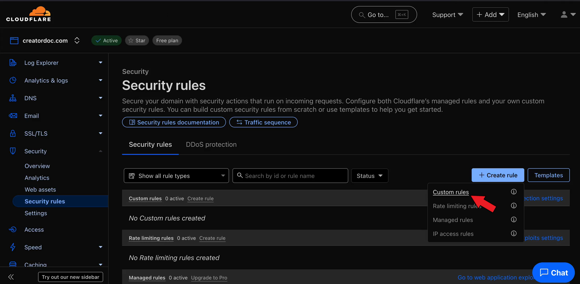 Open your Cloudflare dashboard and go to the Security > Security rules section.&#x20;