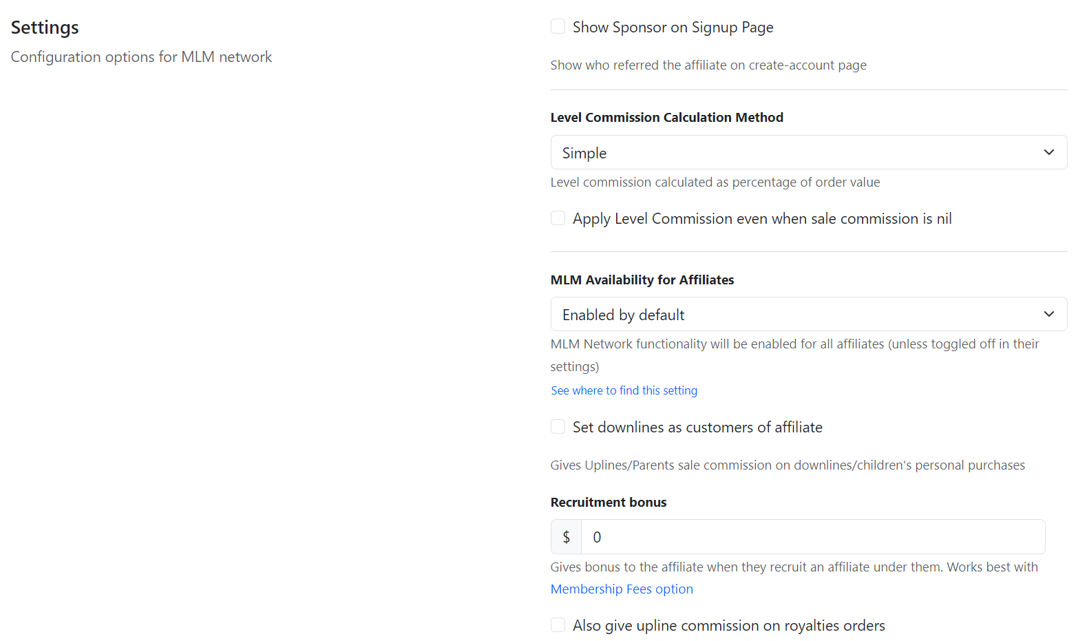 Here, you can select the availability of the multi-level marketing feature for affiliates.&#x20;