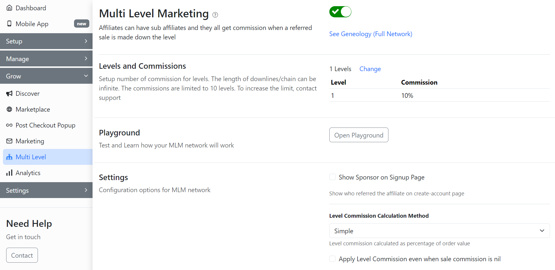 To change the availability of the multi-level network for affiliates, go to the **Settings** section in the **Multi Level** tab of the GoAffPro admin panel.