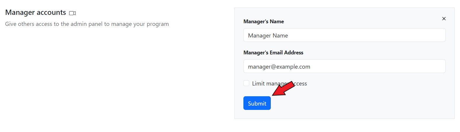 <figure><img src="https://1200686697-files.gitbook.io/~/files/v0/b/gitbook-x-prod.appspot.com/o/spaces%2F-LdPzLtyP46oY7cyXnkw%2Fuploads%2F6AGrqvOq2W6hPcjeKiVf%2FScreenshot%202023-11-06%20153905.png?alt=media&#x26;token=c4c50a04-a4dc-41da-92f9-f0a71953a822" alt=""><figcaption><p>Set the manager's name and email address</p></figcaption></figure>