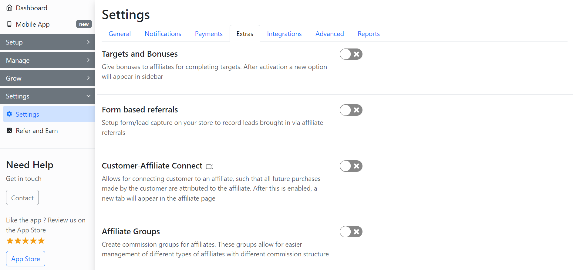 To set up a manager account for multiple affiliate programs, go to the **Extras** section in the **Settings** tab of the GoAffPro admin panel.
