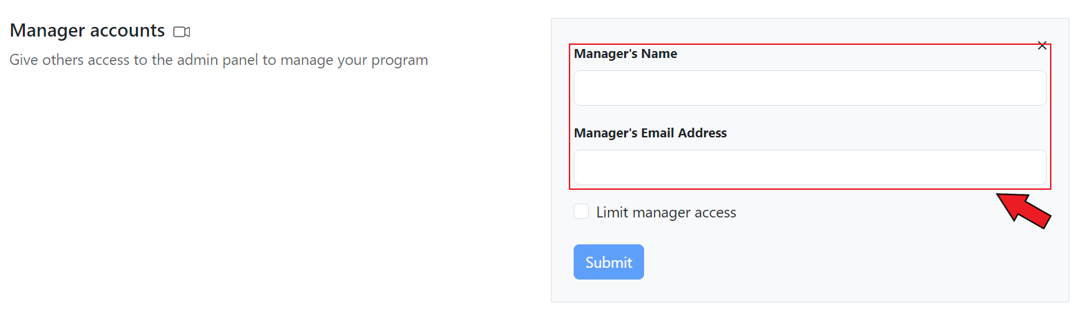 Next, set the name and email address for the manager account. After this, click on **Submit**.&#x20;
