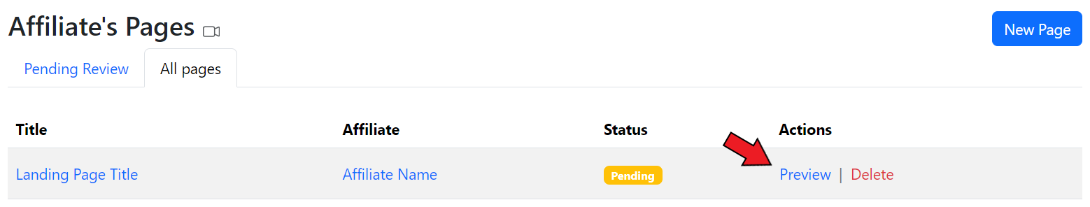 To delete an affiliate's landing page, click on **Delete** in the All Pages section.&#x20;