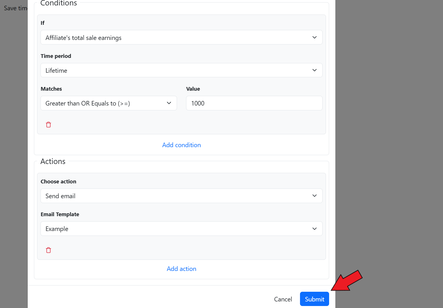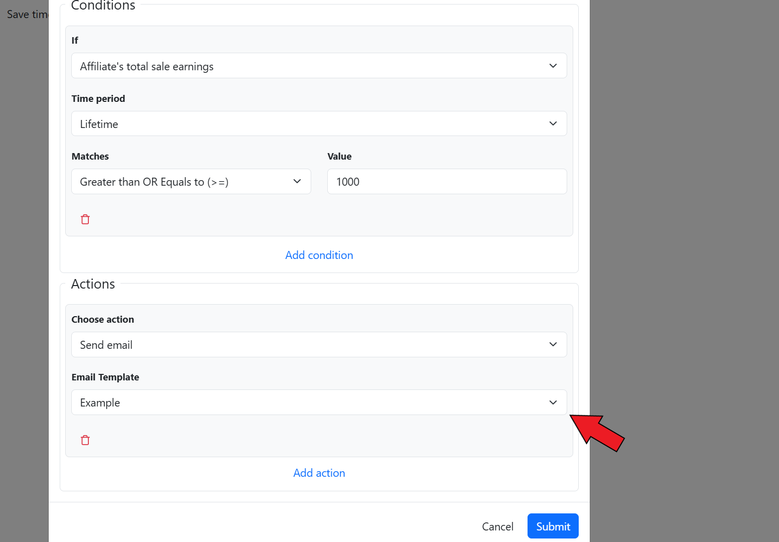 You can configure the action based on the parameter you select. For example, if you choose the action to send an email, you will have the option to select the email template that will be sent to the affiliate once the condition is met.