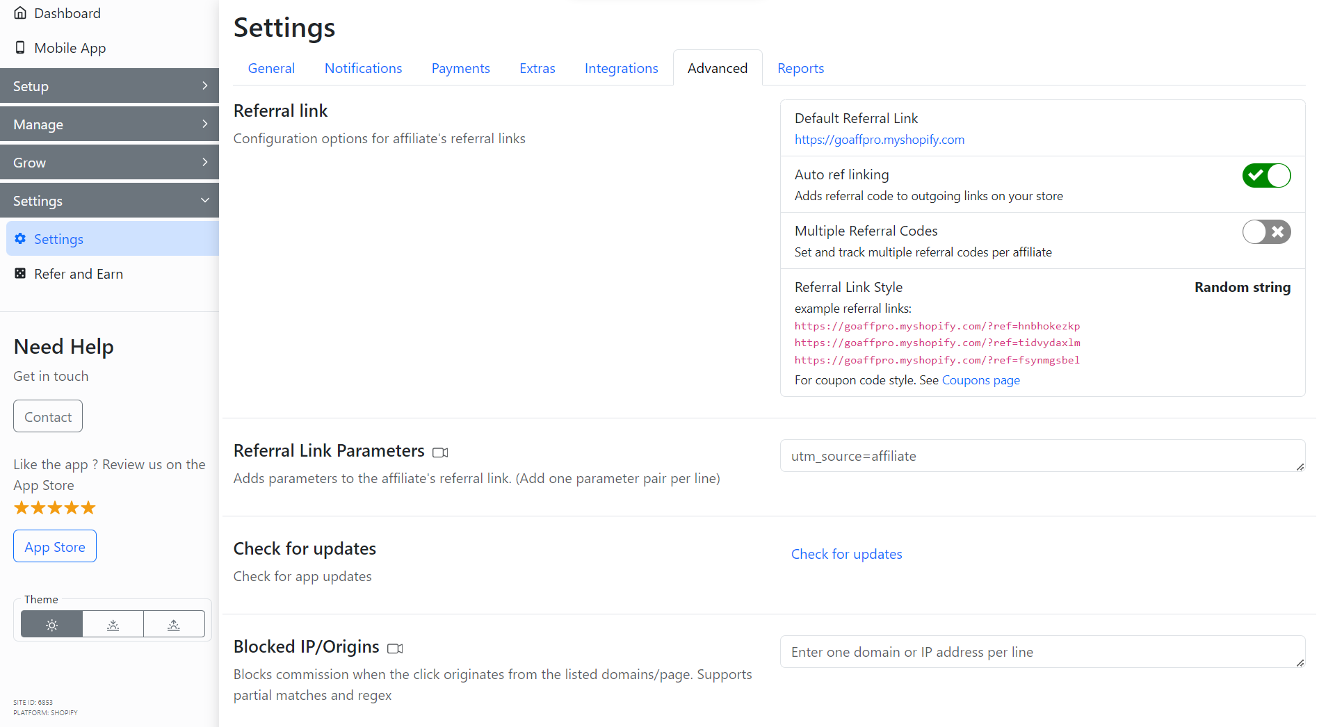 To allow affiliates to have multiple referral codes, go to the Advanced section of the Settings tab in the GoAffPro admin panel.