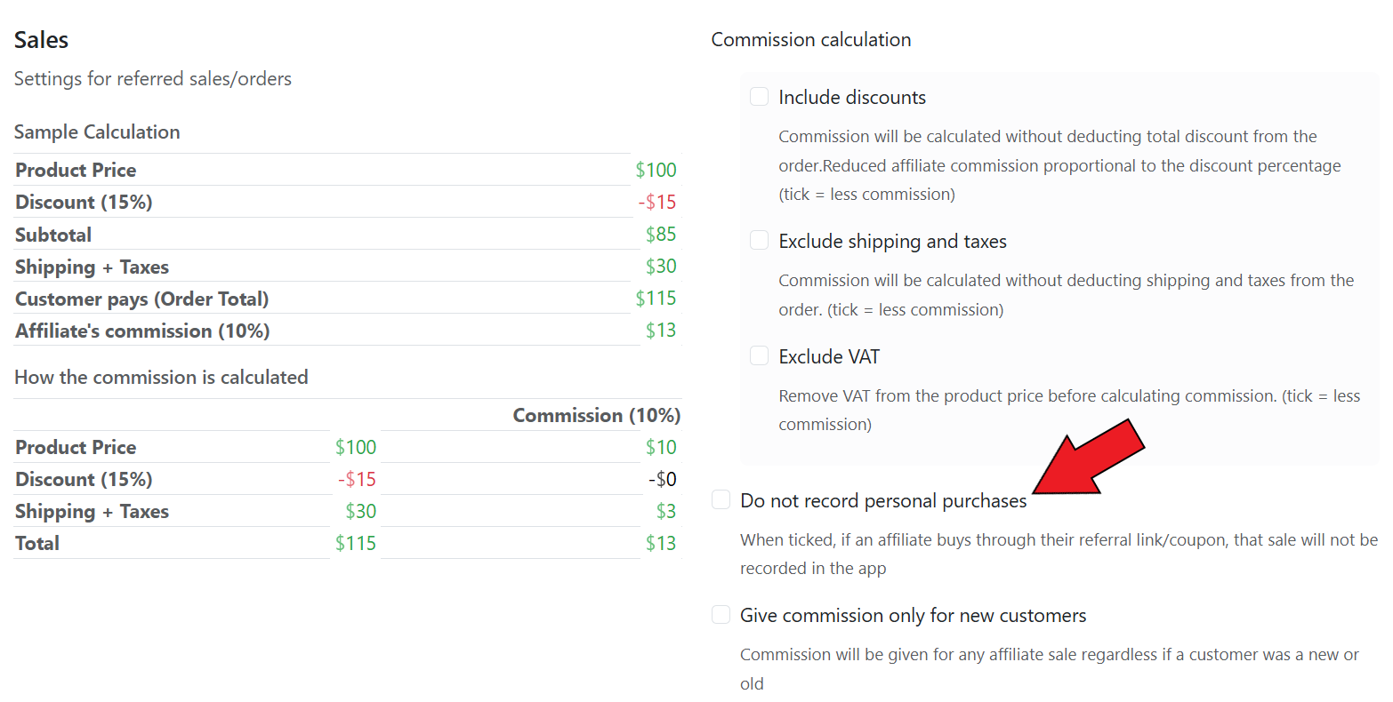 If enabled, affiliates will not receive the commission for personal purchases they make in your store.&#x20;