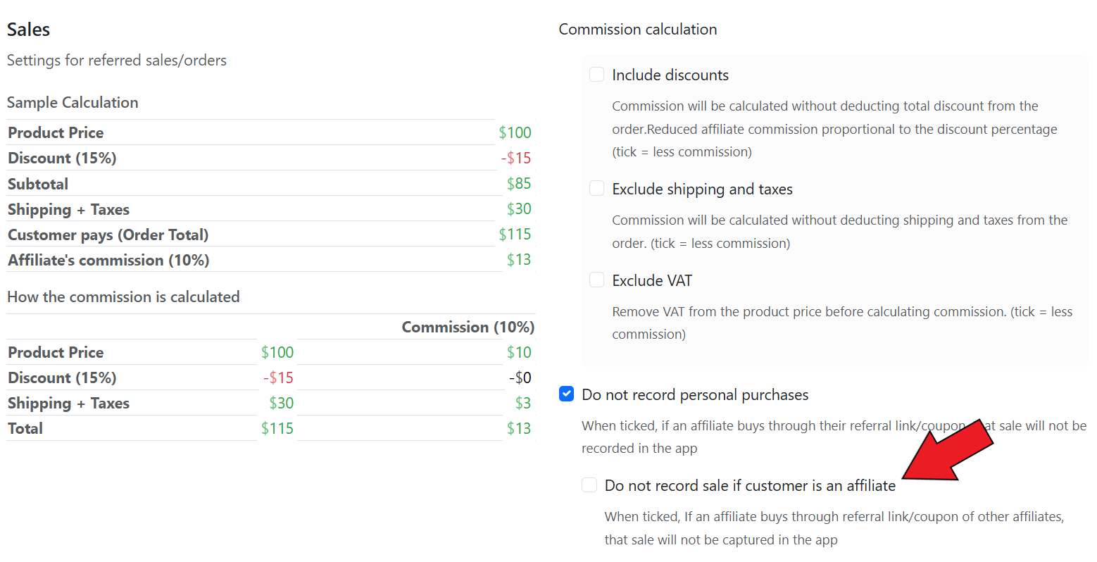 <figure><img src="https://1200686697-files.gitbook.io/~/files/v0/b/gitbook-x-prod.appspot.com/o/spaces%2F-LdPzLtyP46oY7cyXnkw%2Fuploads%2FlgBamnIYHztnXXTV9gU4%2FScreenshot%202025-02-18%200140204.png?alt=media&#x26;token=2e5ed8a7-70ed-40c2-8b96-ae56ae2cfdcf" alt=""><figcaption><p>Enable the "<strong>Do not record sale if customer is an affiliate</strong>" option</p></figcaption></figure>